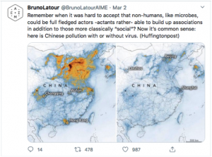 Etwas mehr im Einklang mit dem, was ich oben angesprochen habe, steht eine Bemerkung von Bruno Latour aus Zeit vor dem Ausbruch des Virus. Sie ist heute um so relevanter, da Latour hier die Biopolitik auf alle Lebewesen ausgedehnt hat, über den menschlichen Körper hinausgehend, und zwar im Kontext dessen, was er eine universelle „Krise der Zeugung“ nennt. Während Agamben in der gegenwärtigen Krise eine dystopische Botschaft liest, geht Latour einen ganz anderen Weg, indem er die Pandemie zwar wie Agamben als Bestätigung seiner Theorie betrachtet, sie aber in ein positiveres Licht rückt. In einem kürzlich erschienenen Twitter-Beitrag schreibt er: „Erinnern Sie sich, als es schwer zu akzeptieren war, dass Nichtmenschen, wie Mikroben, vollwertige Akteure sein können? Raten Sie mal, jetzt gehört es zum ‚gesunden Menschenverstand‘, sich auf das schiere Verschwinden der Luftverschmutzung in China zu beziehen. Können wir jetzt leichter atmen?“ Pierre Charbonnier, Autor des kürzlich erschienenen Buches Abondance et liberté: Une histoire environnementale des idées politiques, war schnell anderer Meinung: „Das Problem besteht hier darin, dass sich die Wirtschaft verlangsamt, ohne dass wir wirklich ‚auf den Boden der Tatsachen‘ zurückkehren würden. Das vom Überwachungsstaat geforderte Notbremssystem unterscheidet sich sehr von der Erfindung irdischer Infrastrukturen! (denn China wird seine Vermögensverluste bald wieder aufgeholt haben.“