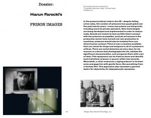 Der “Gefängnisbilder”-Komplex, dem sich Harun Farocki ab Mitte der 1990er Jahre intensiv gewidmet hat, ist in Bezug auf seine gegenwärtige Relevanz einer der laufenden Forschungsschwerpunkte des Instituts. Seit 2018 hat HaFI Workshops zu dem Thema in Berlin und New York durchgeführt. Ein Resultat der Auswertung von Harun Farockis Archivmaterialien zum Einsatz von Bild-Technologien im “prison-industrial complex” kann in AMERICA. Films from Elsewhere (2019), herausgegeben von Shanay Jhaveri, nachgelesen werden. Das Dossier „Harun Farocki’s Prison Images“, zusammengestellt von Tom Holert, Doreen Mende und Volker Pantenburg, besteht aus einer Auswahl von Dokumenten und Bildern aus dem HaFI-Archiv.