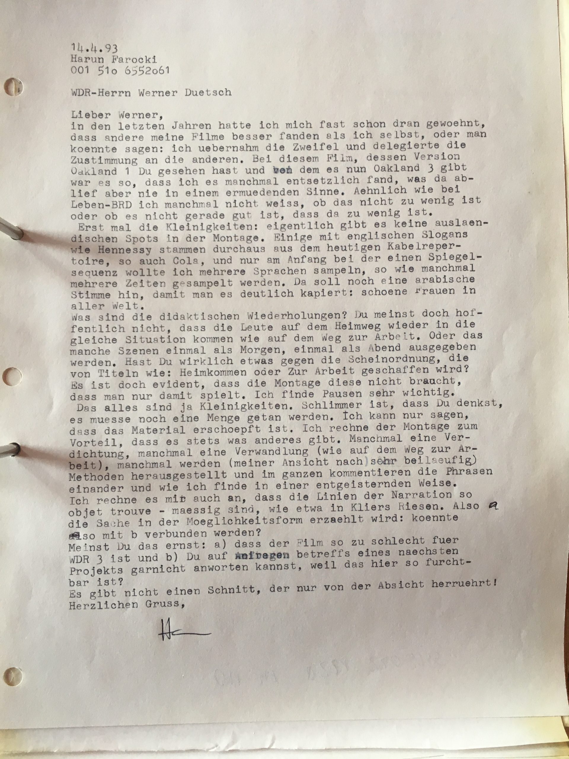 Ein Brief Farockis an den Redakteur Werner Dütsch aus dem April 1993. Gegen die offenbar kritischen Einwände Dütschs erläutert Farocki sein Vorgehen und einige der Prinzipien der Montage. Der Film wurde vom WDR co-produziert, die Redaktion lag bei Ebbo Demant (SWF). Erstausstrahlung: 24. Juni 1993, ARD.