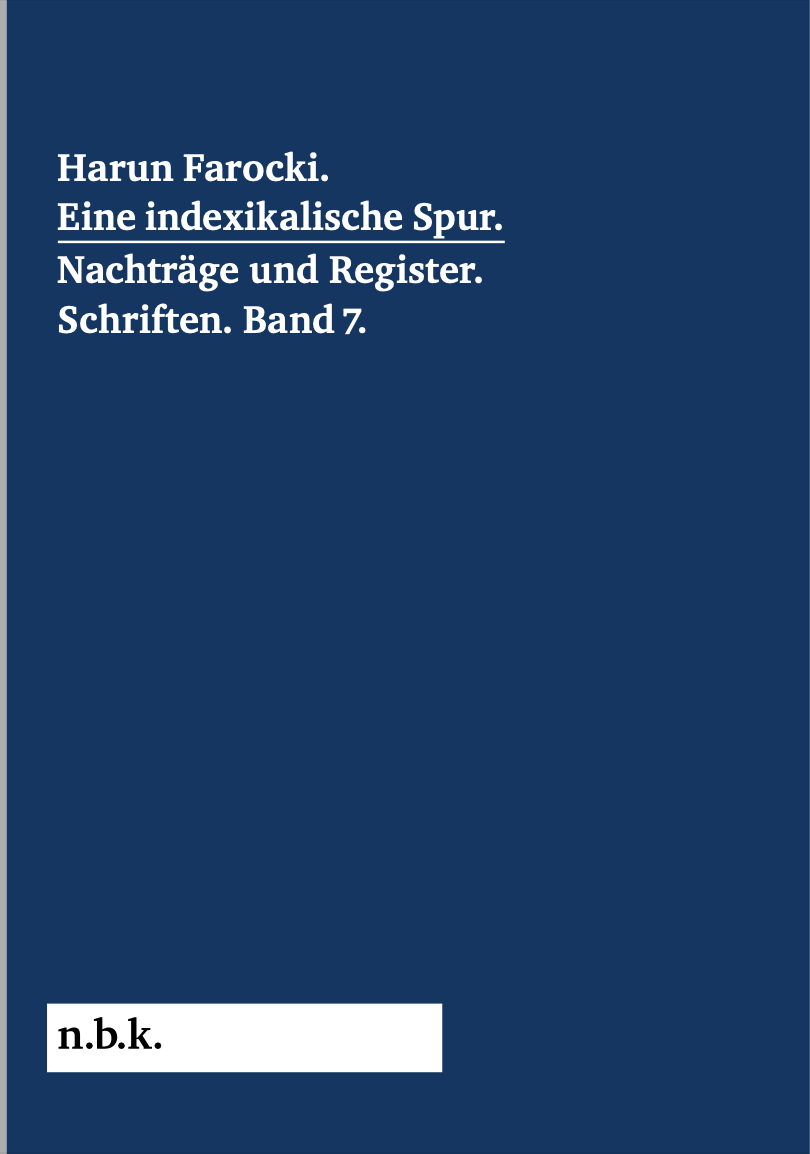 Harun Farocki: Eine indexikalische Spur. Nachträge und Register, hg. von Volker Pantenburg unter Mitarbeit von Gerti Fietzek, Köln: Walther und Franz König 2026 [= Harun Farocki: Schriften, Bd. 7] (erhältlich hier)